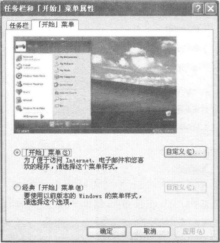 ①在“开始”菜单上单击鼠标右键,在弹出的快捷菜单中选择“属性”菜单命令,打开“任务栏和‘开始’菜单属性”对话框,如图2-3所示。