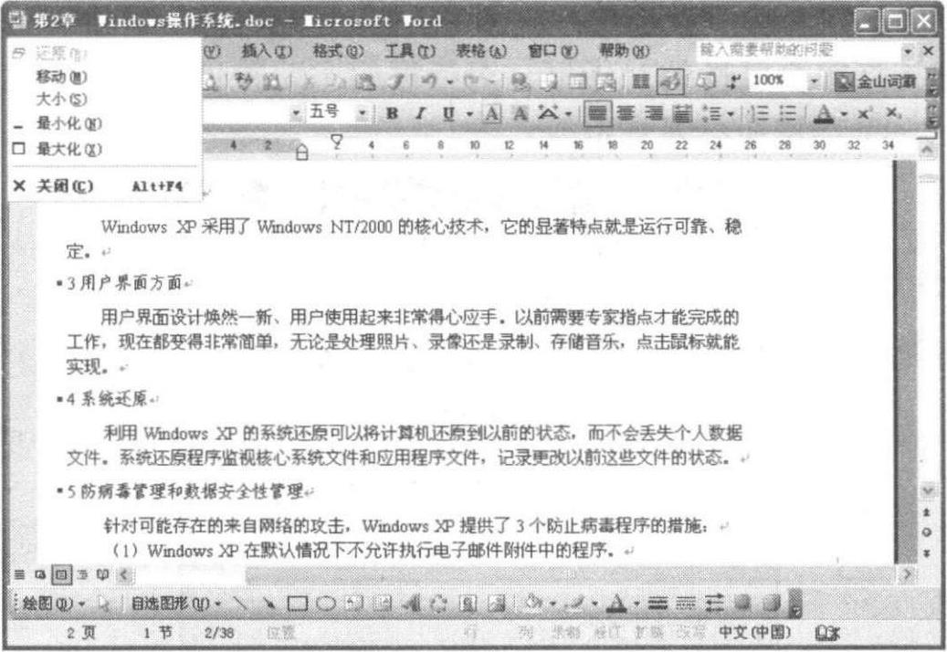 控制菜单框位于标题栏的左边,也叫系统菜单,单击控制菜单框,可以打开一个隐藏的菜单,如图2-9所示。