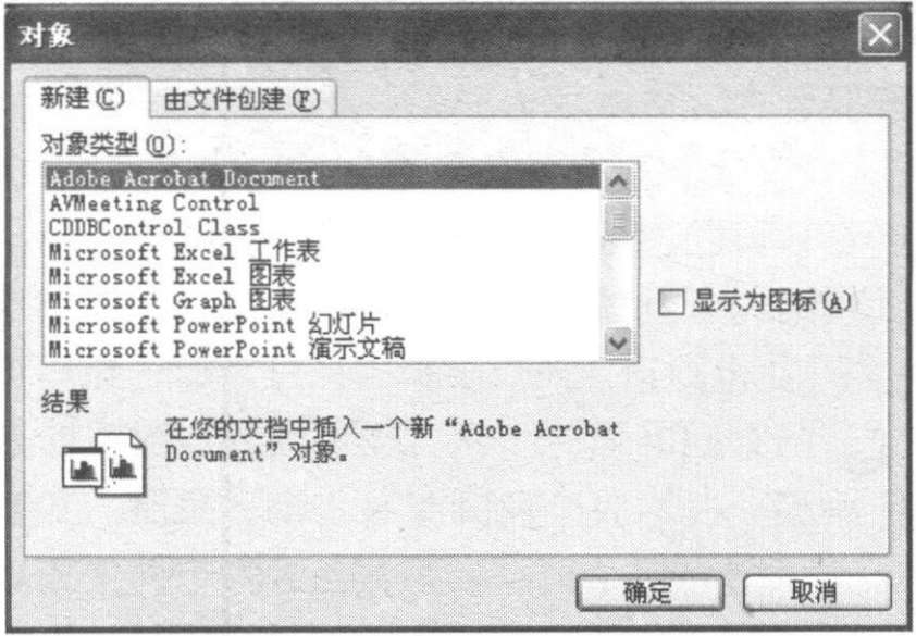 选择Word窗口“插入”菜单中的“对象”菜单命令,打开如图2-11所示的对话框。该对话框中的“对象类型”列表框就是普通列表框。