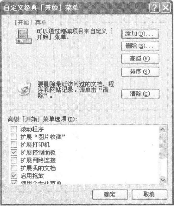 ②选中“经典‘开始’菜单”单选按钮,单击“自定义”按钮,打开如图2-4所示的对话框。