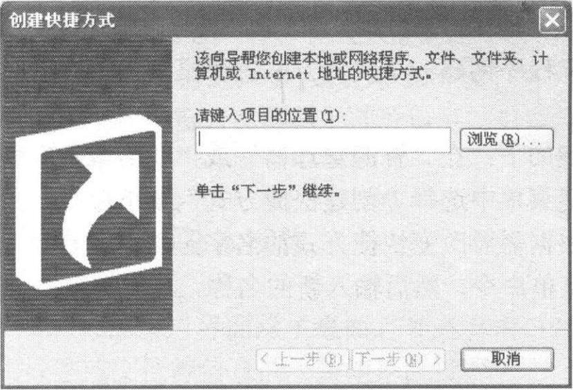 ③单击“添加”按钮,可以打开如图2-5所示的“创建快捷方式”对话框,在“请键入项目的位置”文本框内输入应用程序的位置和名称,或者单击“浏览”按钮来选择应用程序。