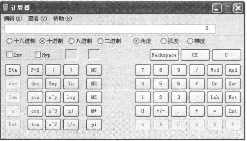 计算器中可以使用十六进制、八进制、十进制及二进制进行计算,对角度也可以采用弧度、角度和梯度三种表示方法。一般使用标准计算器就可以了,这种计算器能够提供日常事务所需的常用数学计算。如果需要使用高级的计算,可以使用科学计算器。单击“查看”菜单,选择“科学型”菜单命令,可打开科学计算器,如图2-16所示。它的使用方法和标准计算器类似。使用科学计算器可以进行更多的计算,例如,统计及三角计算等。