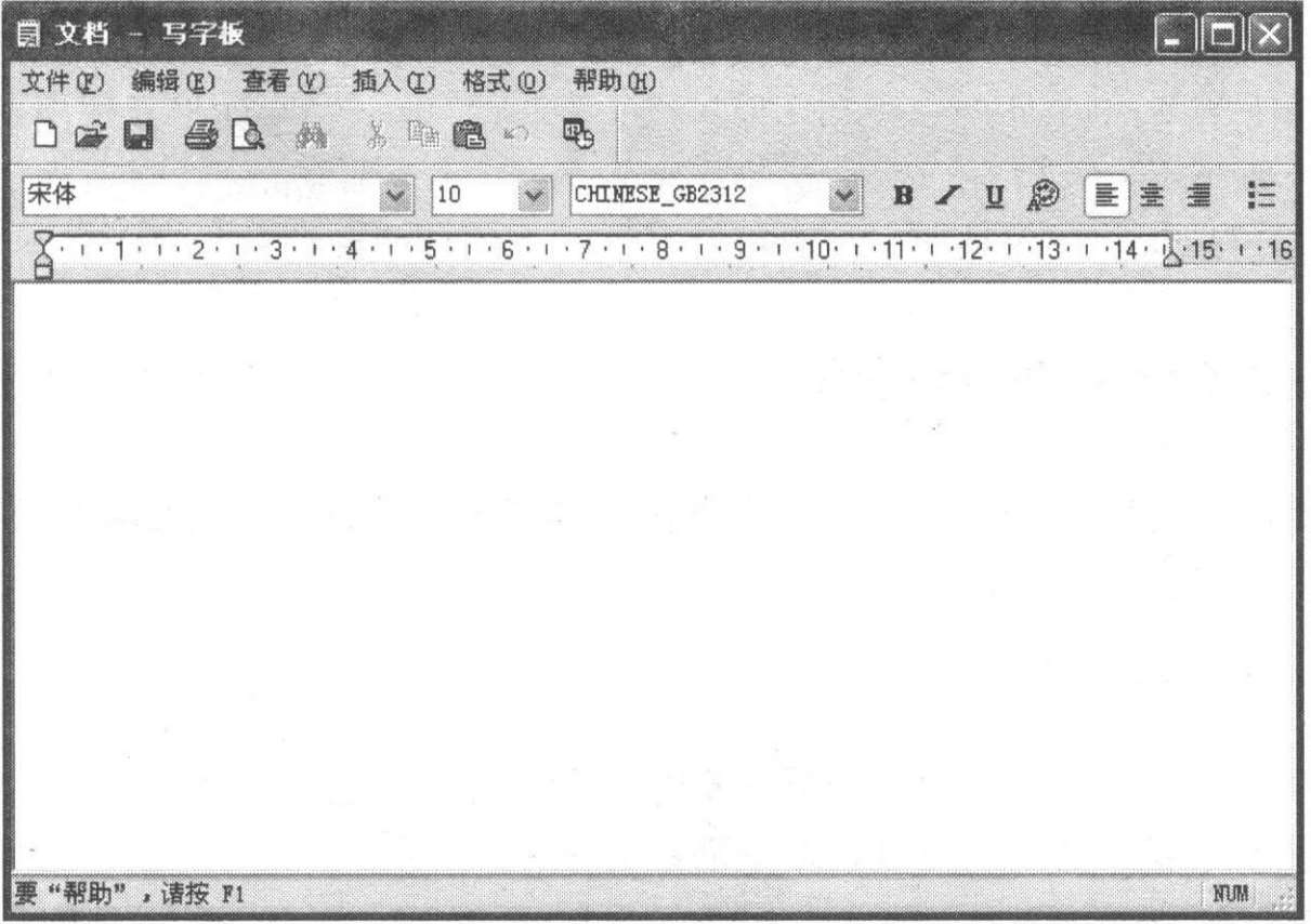 在Windows的桌面上执行“开始”→“所有程序”→“附件”→“写字板”菜单命令,打开如图2-19所示的窗口。写字板是另一个文本编辑器,适于编辑具有特定格式的短小文档。