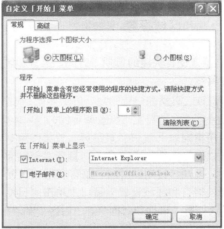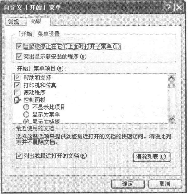 在该选项卡中,可以设置是否突出显示新安装的程序,是否当鼠标停留在菜单上时打开相应的程序。在“‘开始’菜单项目”列表框中可以选择在“开始”菜单中显示的项目,只要选中相关对象前面的复选框即可。