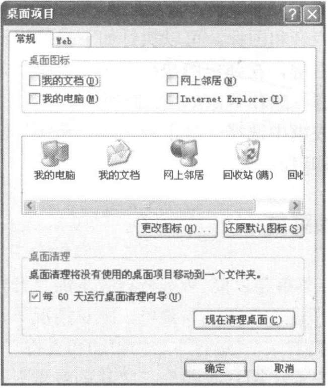 单击“自定义桌面”按钮,打开“桌面项目”对话框,如图2-38所示。该对话框有“常规”和“ Web ”两个选项卡。在“常规”选项卡的“桌面图标”选择区域,可以选择是否在桌面上显示我的文档、我的电脑、网上邻居和InternetExplorer等。如果要显示,选中相应的复选框即可。