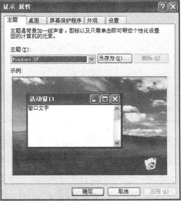 (1)在桌面上单击鼠标右键,在弹出的快捷菜单中选择“属性”菜单命令,打开“显示属性”对话框,选择“主题”选项卡,如图2-35所示。