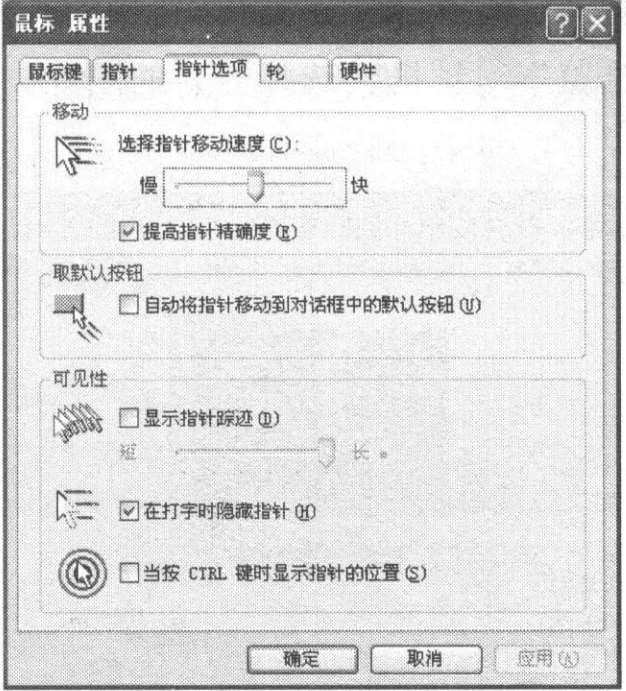 (2)在“打印机和其他硬件”窗口上单击“鼠标”,打开“鼠标属性”对话框,选择“指针选项”选项卡,如图2-34所示。
