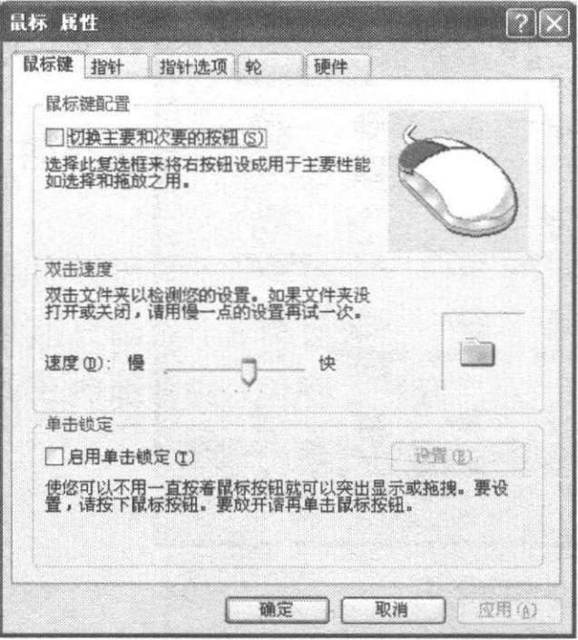 (2)在“打印机和其他硬件”窗口上单击“鼠标”,打开“鼠标属性”对话框。该对话框有鼠标键、指针、指针选项、轮和硬件5个选项卡,选择“鼠标键”选项卡,如图2-32所示。