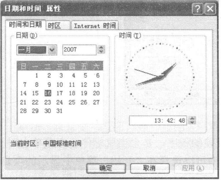 (2)在“日期、时间、语言和区域设置”窗口上单击“日期和时间”,打开“日期和时间属性”对话框,该对话框有“日期和时间”、“时区”和“Internet时间”三个选项卡,选择“日期和时间”选项卡,如图2-43所示。
