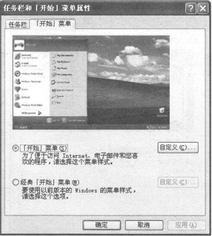 要进行“开始”菜单的设置,在“开始”菜单上单击鼠标右键,弹出一个快捷菜单,选择“属性”菜单命令,打开“任务栏和‘开始’菜单属性”对话框,选择“‘开始’菜单”选项卡,如图2-40所示。