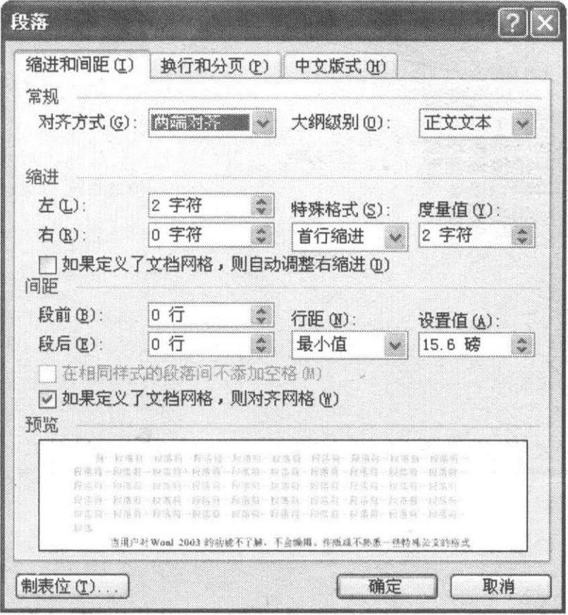 (2)执行“格式”→“段落”菜单命令,弹出“段落”对话框,选择“缩进和间距”选项卡,在该选项卡中可以对段落的间距进行设置。