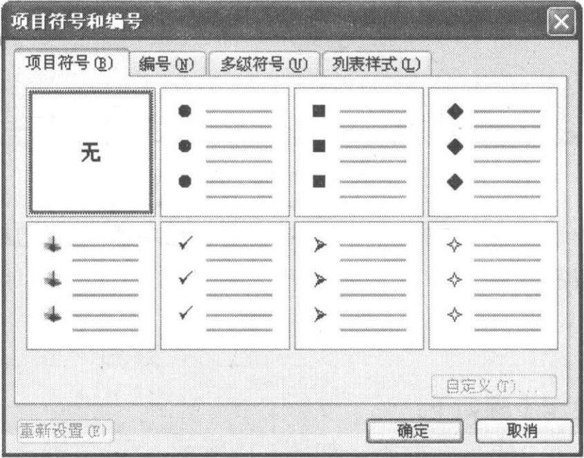 执行“格式”→“项目符号和编号”菜单命令,打开“项目符号和编号”对话框,如图3-20所示。用户可以在该对话框中的“项目符号”选项卡中设置项目符号,如果选择“无”选项框,将不设置项目符号。