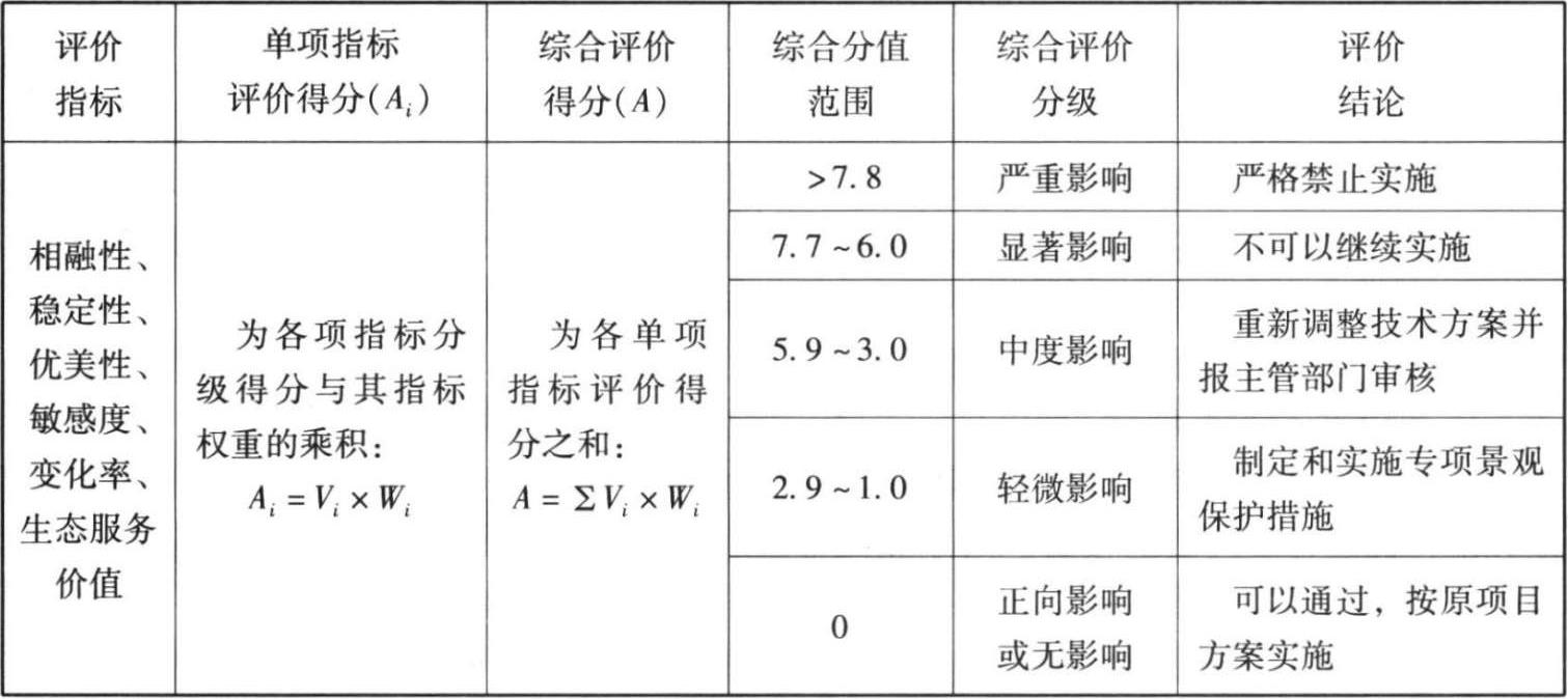 国内目前用得较多的是采用《山岳型风景资源开发环境影响评价指标体系》HJ/T 6—9中的专家咨询法,根据专家评分结果与制订的景观相融性评价标准进行对比,据此掌握项目与自然景观的协调程度,判断项目的可行性。另外,还有引用景观生态方法进行自然景观影响评价,主要是通过项目实施前后景观变化情况来分析评价项目对自然景观的影响。为了较为全面和真实地反映综合复杂的自然景观特征,自然景观影响评价可以使用综合评价法。综合评价法是通过对被评价对象的多个特征因子进行的定性或定量评价,并综合单项评价获得一个整体评价结果。评价步骤为: