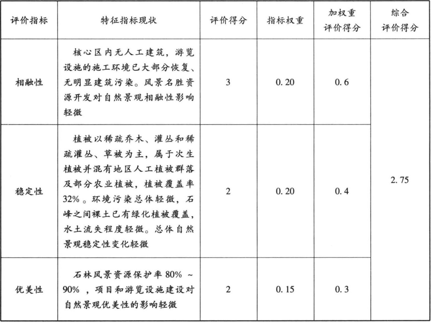云南石林风景名胜项目的自然景观影响评分为 2.75,总体评价结果是“轻微”。需要制定和实施以保护石林岩溶地貌景观和生物群落,严格控制人工建筑为主要内容的专项景观保护措施。