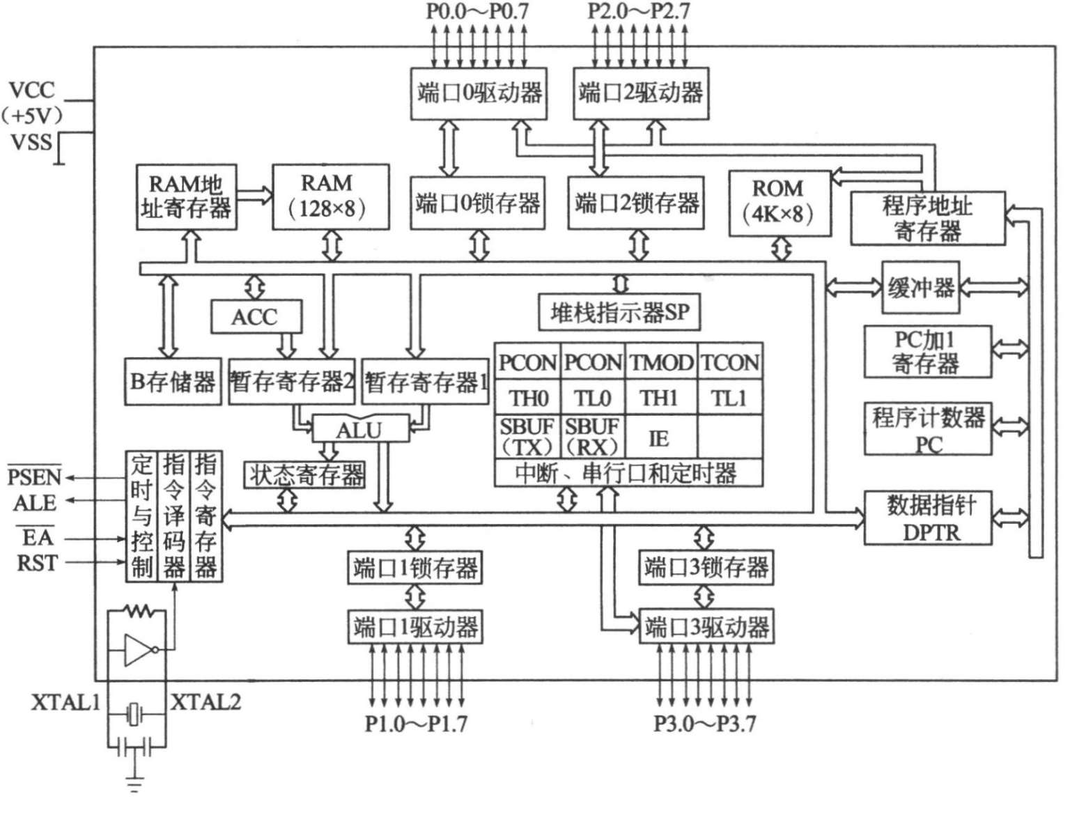 图2-1中4KB的ROM存储器部分用EPROM替换就成为8751的结构组成图;图中去掉ROM部分就成为 8031 的结构组成图。