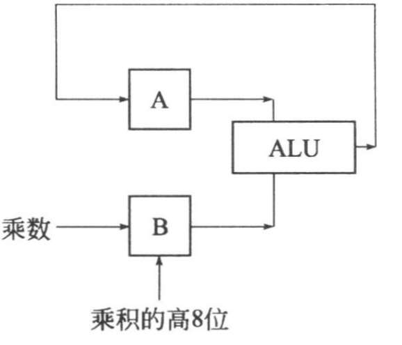 (3)通用寄存器B。是专门为乘法和除法设计的一个 8 位寄存器。该寄存器在乘法或除法前,用来存放乘数或除数,在乘法或除法完成后用于存放乘积的高8位或除法的余数。通用寄存器B运算原理图如图 2-12 所示。