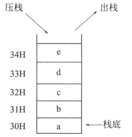 (5)堆栈指示器SP。专门用来存放栈顶地址,能自动加1减1,字长是8位。计算机中存放大量现场数据或中间结果时,常在RAM中划出部分空间,按“先进后出”的原则,组织存放这些数据,这种存放数据的方法称“堆栈”,该空间可大可小,常称为堆栈区。堆栈示意图如图 2-13 所示。
