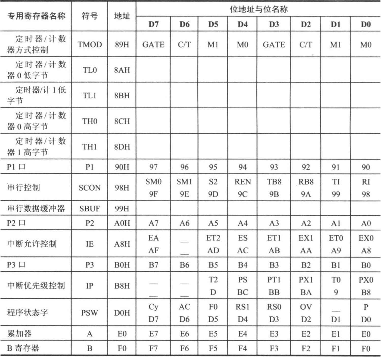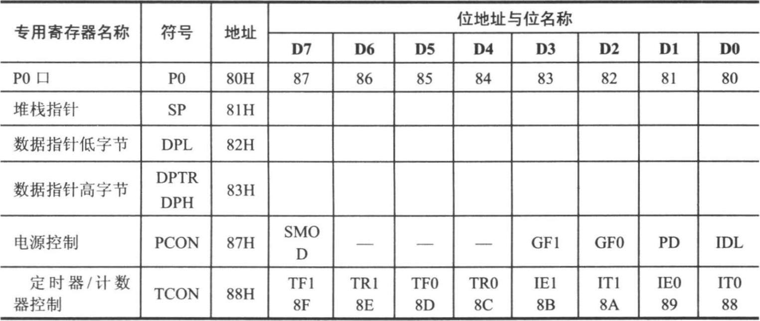 表 2-7 特殊功能寄存器名称、标识符和地址表
