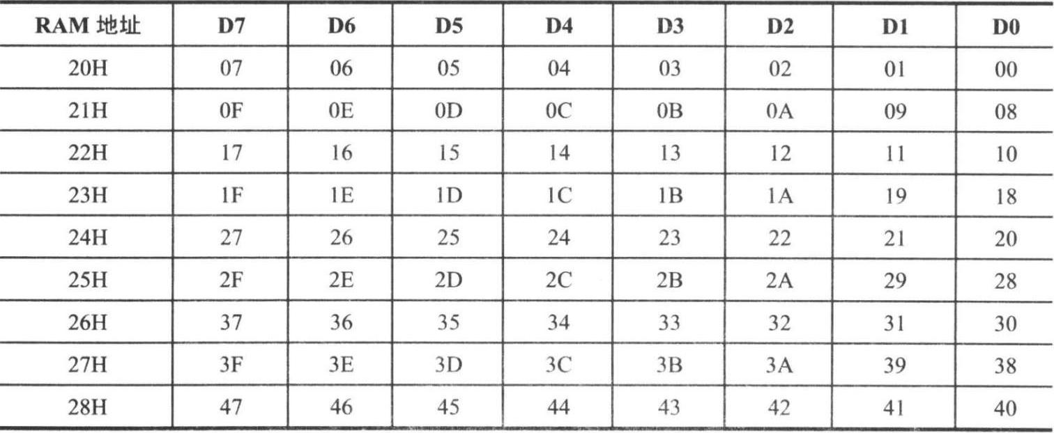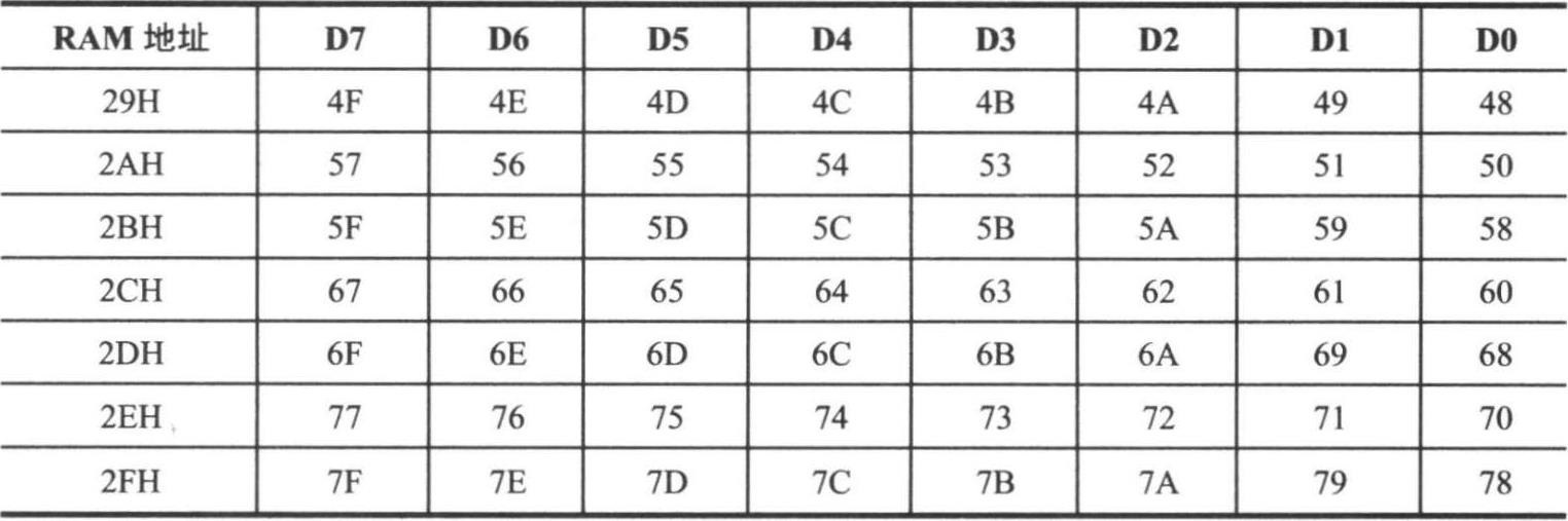 ②位寻址区,20H~2FH单元为位寻址区,每个单元等于 8 位,这 16 个单元(共计128位)的每1位都有一个8位表示的位地址,位地址范围为00H~7FH,如表2-6所示。位寻址区的每1位都可被用户当作软件标志,以 0或1 表示程序中需记忆和查询的标志,由程序直接进行位处理。通常可以把各种程序状态标志、位控制变量存于位寻址区内。同样,位寻址的RAM单元也可以作为一般的数据缓冲,按字节操作。