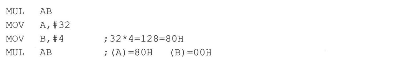 ③寄存器B,是一个辅助寄存器,也叫乘除法寄存器。其地址为0F0H,可位寻址。乘法时,必须是一个数放在A,一个数放在B;乘积结果中高8位放在B中,低8位放在A中。除法时,被除数必须放在累加器A,除数放在B;结果中商放在A,余数放在B。例如: