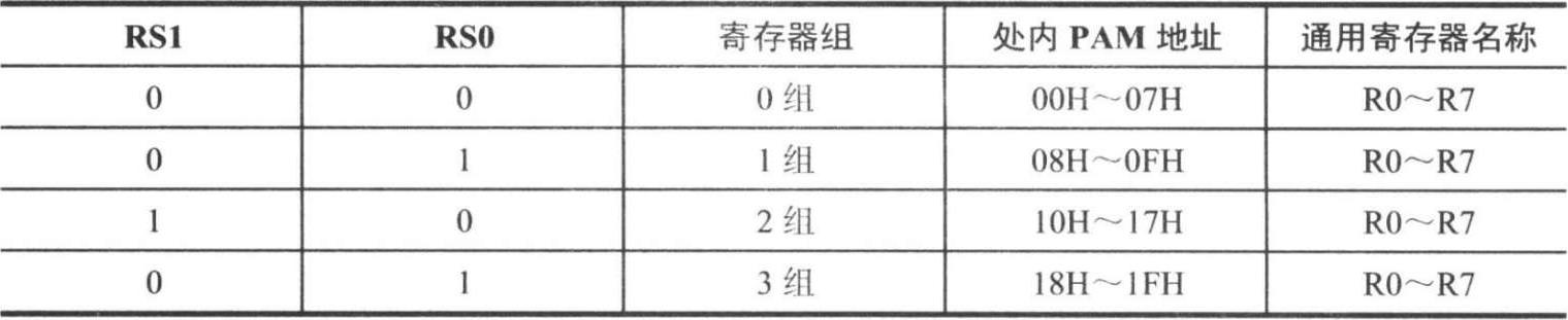 通用工作寄存器共有 4 组,但编写软件时,每次只使用 1 组,其他各组不工作。哪 1组寄存器工作由程序状态字PSW中的PSW.3(RS0)和PSW.4(RS1)两位来选择,其对应关系如表 2-5 所示。复位时,PSW的值等于 00H,所以复位后自动使用 0 区。