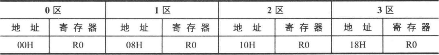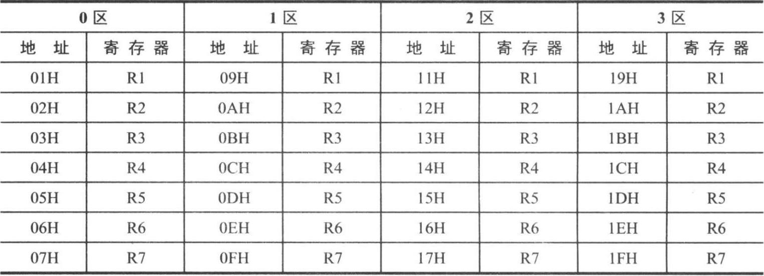 ①工作寄存器区,00H~1FH这 32 单元,称为通用工作寄存器区。它又可分成四个区,分别称为 0 区、1 区、2 区、3 区。每一个区有 8 个通用寄存器R0~R7(每个区的 8个字节从低到高被称为R0~R7)。工作寄存器和RAM地址对应关系如表 2-4 所示。
