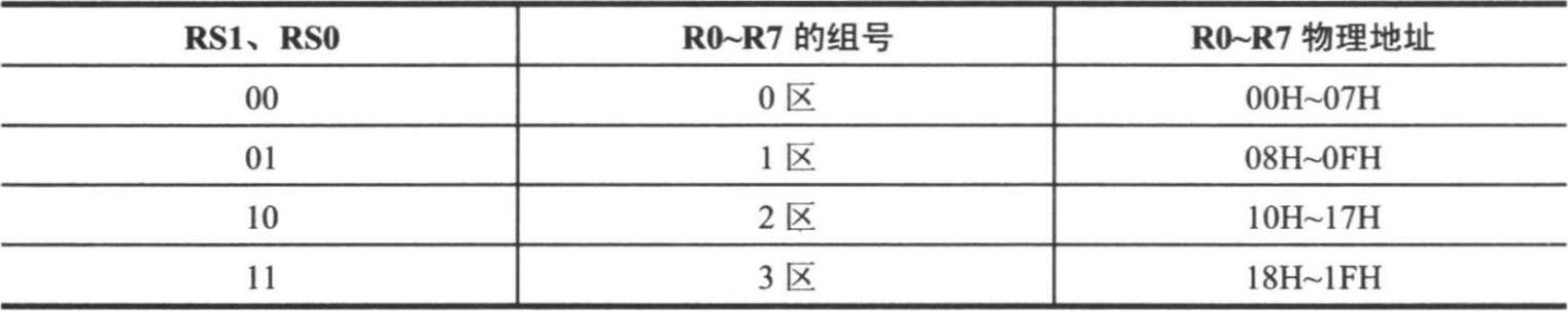 ·寄存器选择位RS1 和RS0,用于选择工作寄存器所在的地址空间。其工作寄存器R0~R7 的物理地址和RS1、RS0 之间的关系如表 2-2 所示。