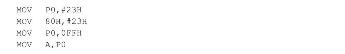 ⑤I/O端口控制/数据寄存器P0~P3,P0(80H)、P1(90H)、P2(A0H)和P3(B0H)口作为通用I/O口时,为准双向口。即当其用作输入方式时,各口对应的锁存器必须先置“1”,然后才能进入输入操作。例如: