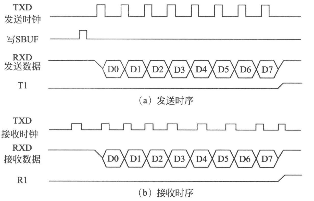 8 位移位寄存器输入/输出方式。多用于外接移位寄存器以扩展I/O端口。波特率固定为fosc/12。其中,fosc为时钟频率。