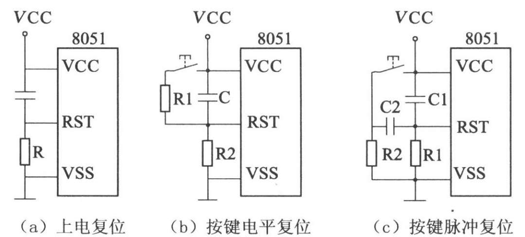 图 2-22(b)和图 2-22(c)是通过RST经电阻与电源相连接或利用RC微分电路产生的正脉冲来实现按键复位的。这两个电路同时也具备上电自动复位的功能。