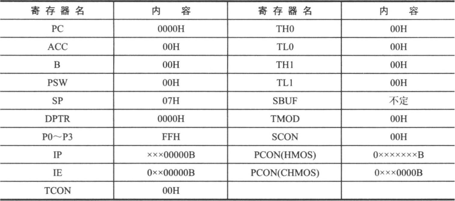复位是单片机进入工作状态的初始化操作,是使CPU和系统中其他部件都处于一个确定的初始状态,并从这个状态开始工作。另外,当程序运行错误或由于错误操作而使单片机进入死锁状态时,也可以通过复位进行重新启动。复位后,单片机内部寄存器的值被初始化,其值见表 2-8。了解单片机内部寄存器初始化的状态,对于熟悉单片机的操作,简化应用程序的初始化过程是很有必要的。