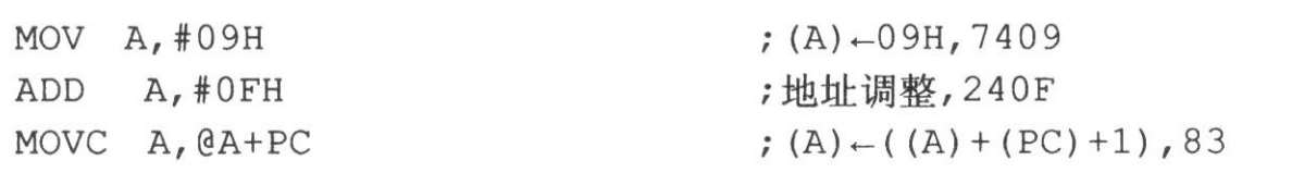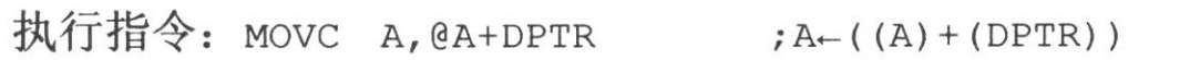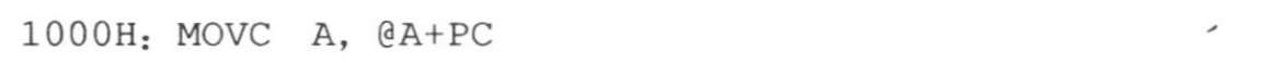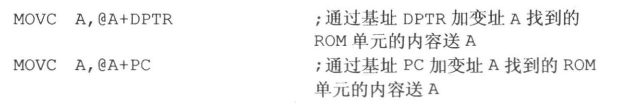 这组指令以PC(或DPTR)作基址寄存器,累加器A的内容作为无符号整数和PC(或DPTR)的内容相加后得到一个 16 位的地址,把由该地址指出的程序存储单元的内容送到累加器A。特别需要注意的是PC的内容是指该条指令执行后的下一条指令的PC值。