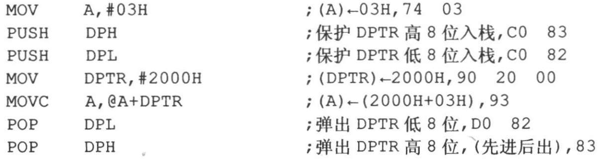 例如:已知(A)=30H,(DPTR)=3000H,程序存储器单元(3030H)=50H,执行指令MOVC A,@ A+DPTR