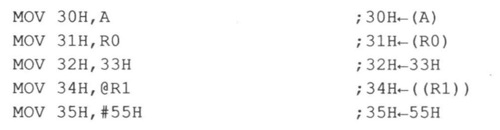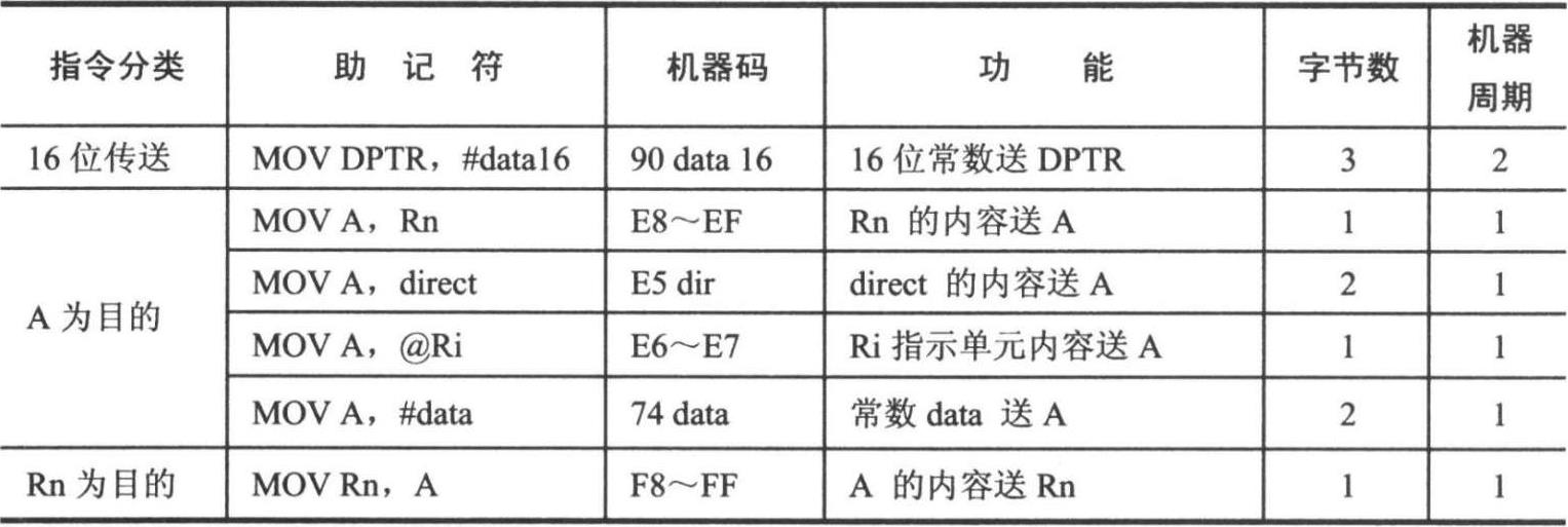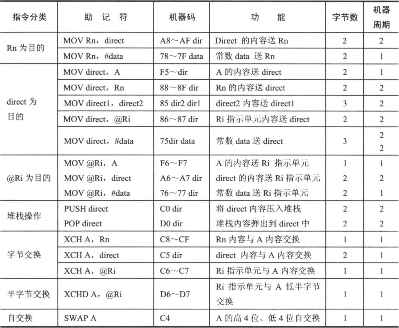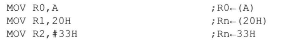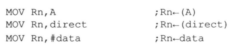 这组指令的功能是将源操作数所指定的内容送到当前工作寄存器组R0~R7 中的某个寄存器中。源操作数可以采用寄存器寻址、立即寻址和直接寻址。