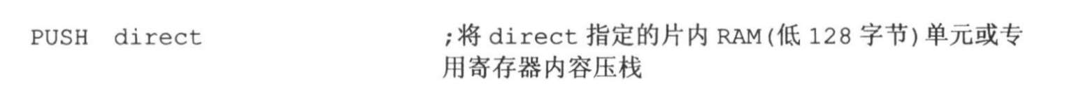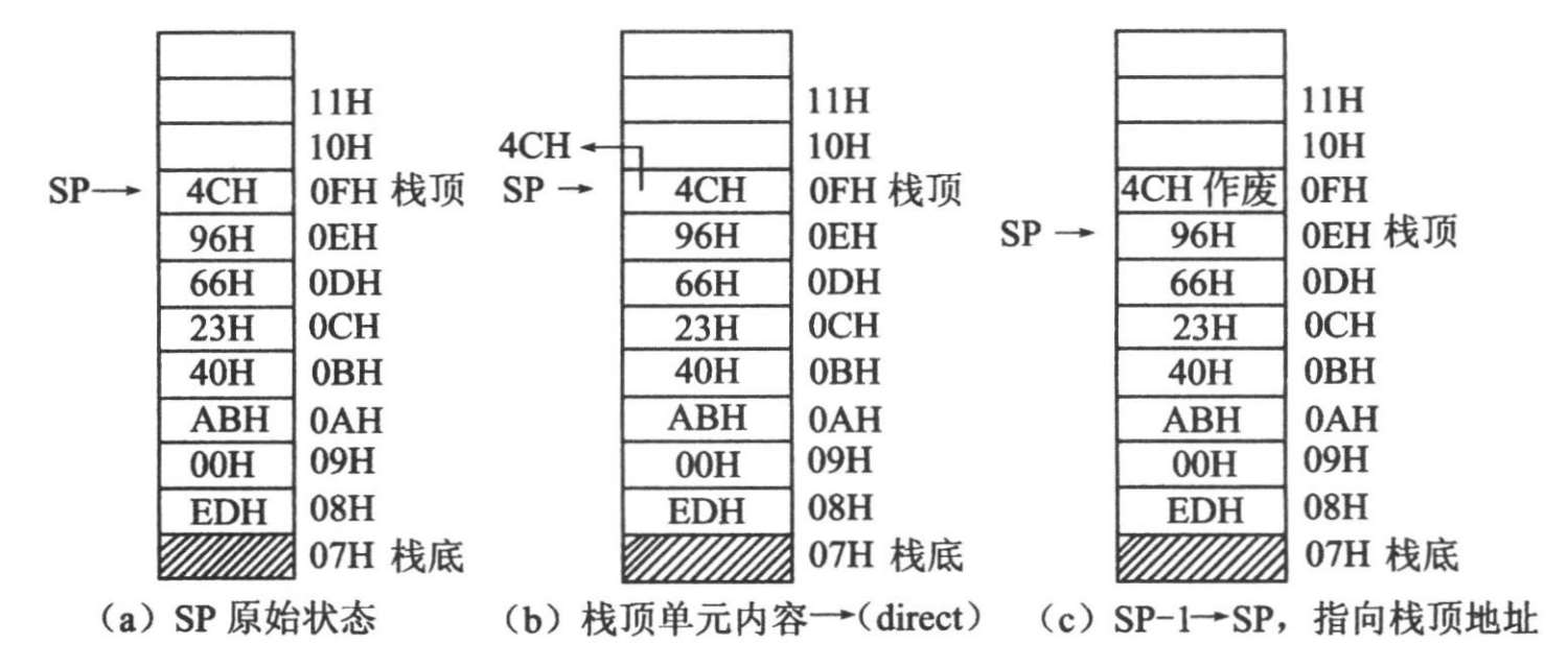 指令执行的操作为:(direct)←(SP);SP←SP-1。