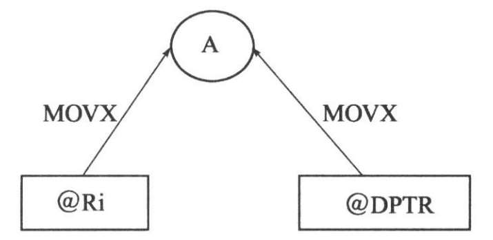 其中第一条和第三条指令是以DPTR作为间址寄存器,其功能是将R0或R1所指定的外部RAM单元与累加器A之间传送数据。由于DPTR是16位地址指针,因此这两条指令的寻址范围可达片外RAM64KB全部空间。而第二条与第四条指令是以R0或R1作为间址寄存器,其功能是将R0 或R1 所指定的外部RAM单元与累加器A之间传送数据。由于R0 或R1 是 8 位地址指针,因此这两条指令的寻址范围仅限于外部RAM 256 个字节单元。