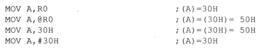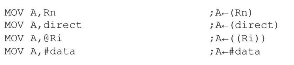 这组指令的功能是将原操作数所指定的内容送入累加器A中。源操作数可以采用立即寻址、直接寻址、寄存器寻址和寄存器间接寻址4种寻址方式。