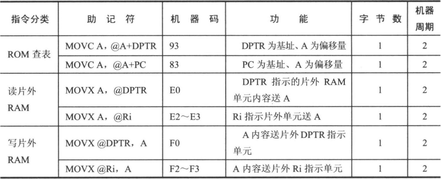 这里所说的程序存储器既包括片内程序存储器,也包括片外程序存储器。由于对程序存储器只能读而不能写,因此其数据传送是单向的,即只能从程序存储器读数据,并送到累加器A中。这类指令有以下两条,指令操作码助记符标志为MOVC。