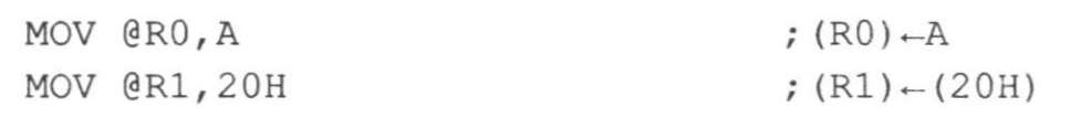 这组指令的功能是把源操作数所指定的内容送入以R0 或R1 为地址指针的片内RAM单元中。源操作数可以采用寄存器寻址、立即寻址和直接寻址3种方式。