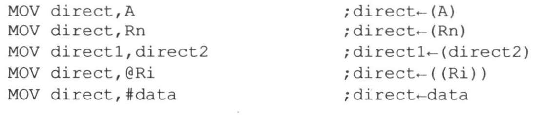 这组指令的功能是将源操作数所指定的内容送入由直接地址direct所指定的片内存储单元。源操作数可以采用寄存器寻址、立即寻址、直接寻址和寄存器间接寻址。