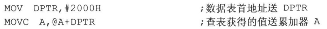 【 例3-1 】在外部ROM/EPROM中,从2000H单元开始依次存放0~9的平方值:0、1、4、9、...、81,要求依据累加器A中的值(0~9)来查找所对应的平方值,分析下述程序的结果。