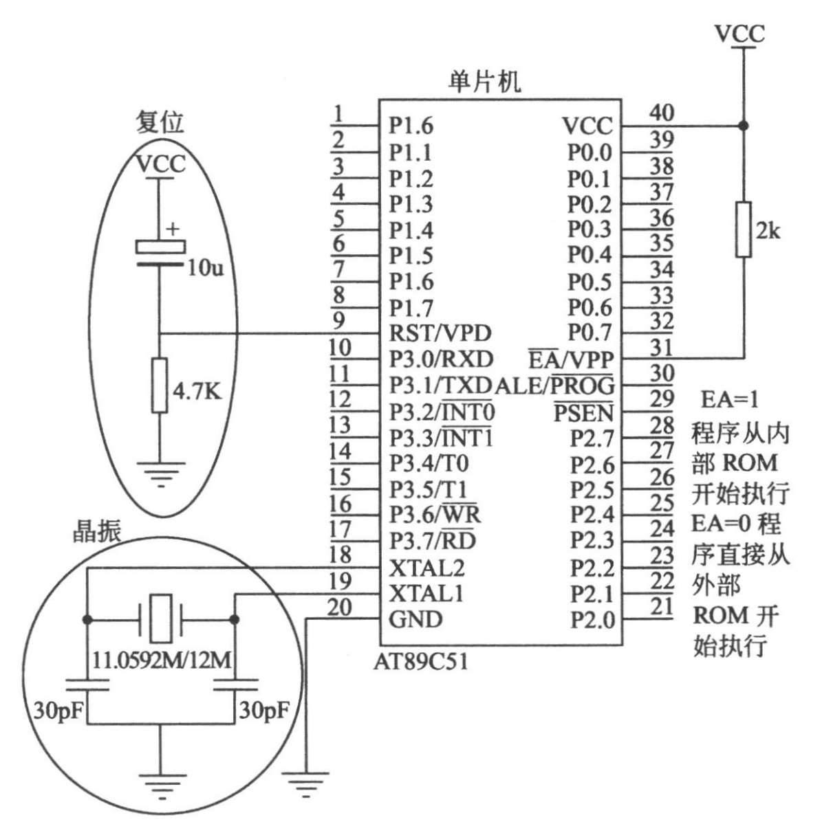 单片机最小系统,或者称为最小应用系统,是指用最少的元件组成的单片机可以工作的系统。对 51 系列单片机来说,最小系统一般应该包括:单片机、晶振电路、复位电路。下面给出一个 51 单片机的最小系统电路图如图 1-6 所示。