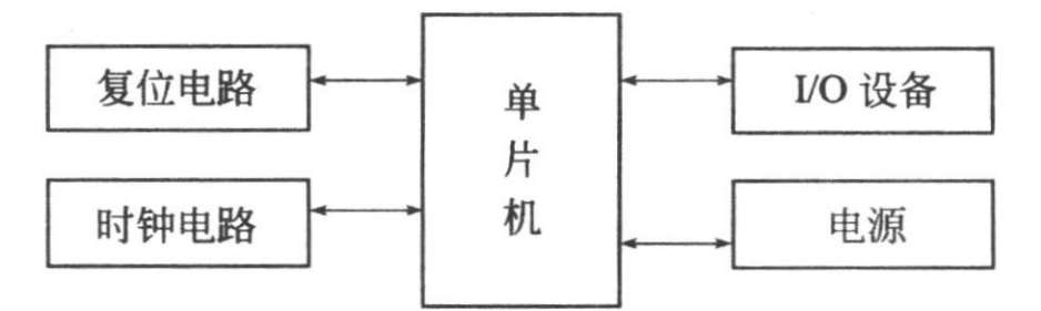 单片机的基本系统也称为最小系统,这种系统选择的单片机内部资源已能满足系统的内部要求,不需外接存储器或I/O接口等扩展部件,即这种单片机内含有用户的程序存储器(用户程序写入到内部只读程序存储器),例如EPROM型单片机、E2PROM型单片机、FlashMemory型单片机、定制的ROM型单片机。换言之,它是由一片片内含有程序存储器和数据存储器的单片机构成,仅在外部配以电源I/O设备等。单片机的基本系统结构如图 1-5 所示。