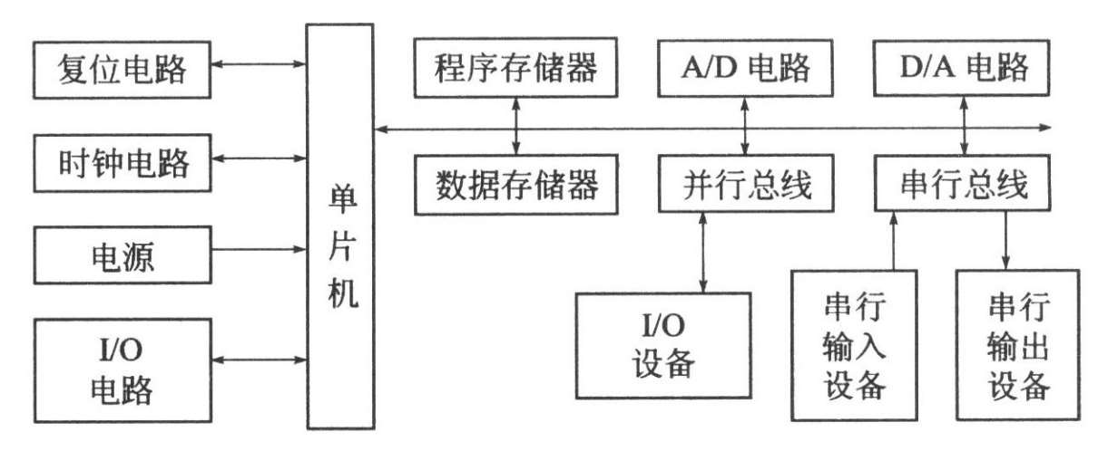 单片机的扩展系统是通过单片机的并行扩展总线(地址总线、数据总线、控制总线)或串行扩展总线(如SPI或I2CBUS)在外部扩展程序存储器、数据存储器、I/O接口等,以弥补单片机内部资源的不足,满足特定的应用系统的功能需要。单片机扩展系统结构如图1-7所示。