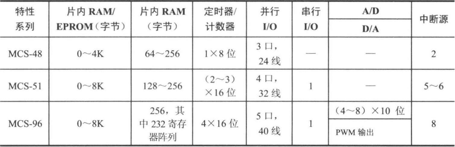 Intel公司从其生产单片机开始,发展到现在,大体上可分为 3 大系列:MCS-48 系列、MCS-51系列、MCS-96 系列。该 3 大系列的性能简介见表 1-5。