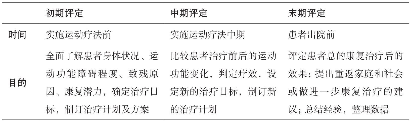 运动疗法评定分为初期评定、中期评定和末期评定3个阶段,各阶段评定的时间和目的见表1-1。