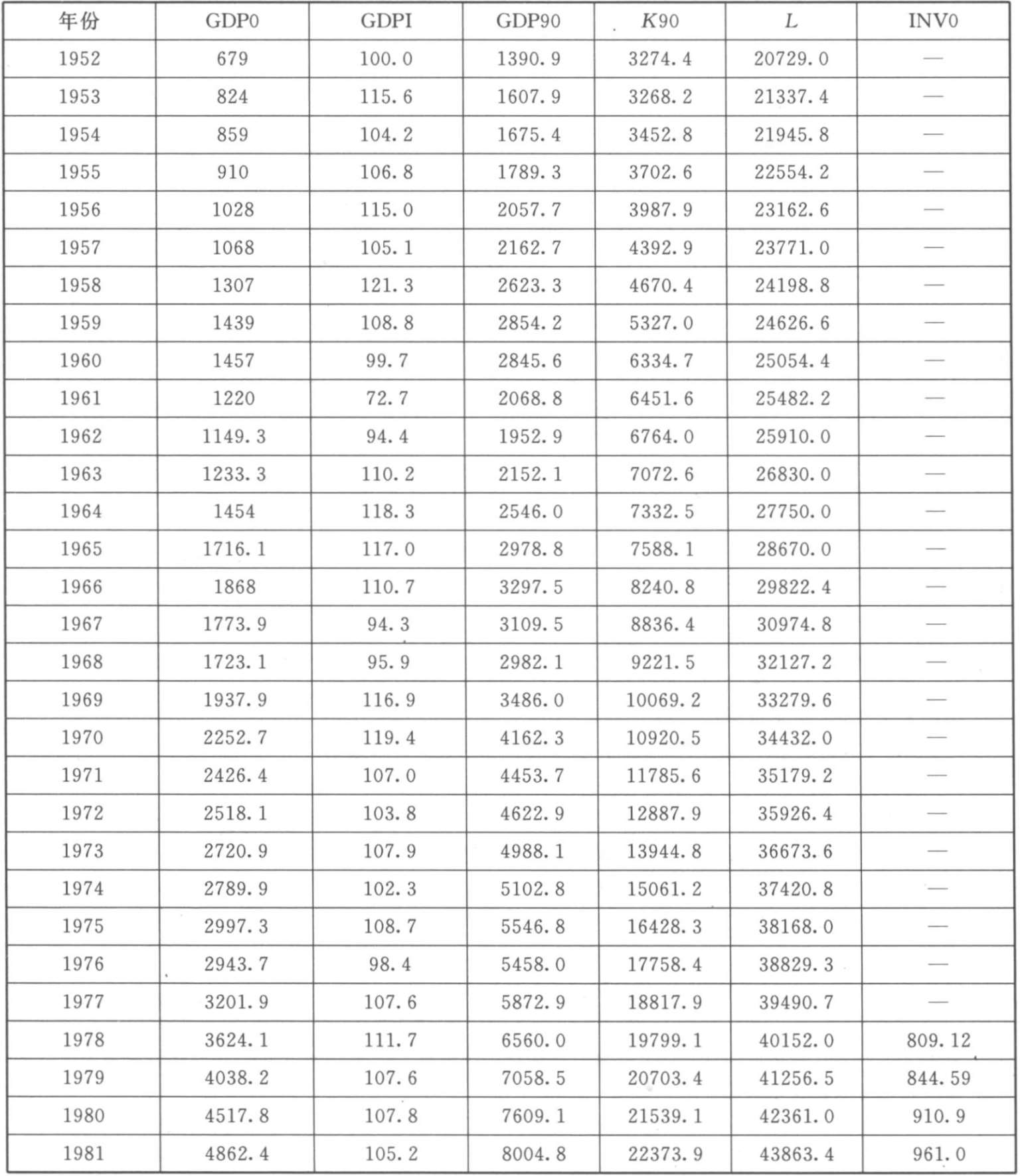 K 90为全社会总固定资产,根据国家统计局历年公布数据推算得出(1990年价格),1952~1977年全社会总固定资产采用《中国统计年鉴》(1988 、1989)全社会物质生产部门的总固定资产数据乘以系数修正的方法,其中,1952基数年的数据采用了邹至庄(Gregory Chow : Capital Fomation and Economic Growth in China ,The Quarterly Journal of Economics, Vol. 108 , No. 3 ,809~842 ,1993)的研究结果;1978年以后则采用如下递推公式推算得出: