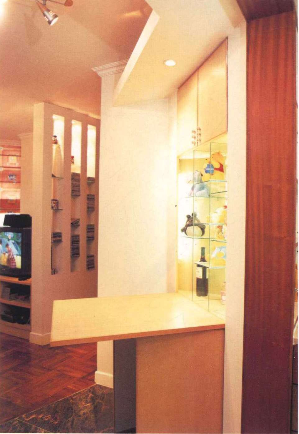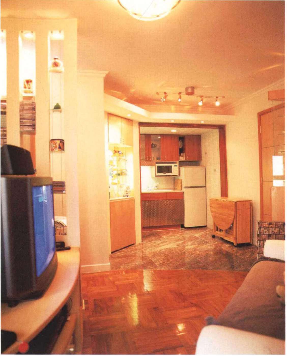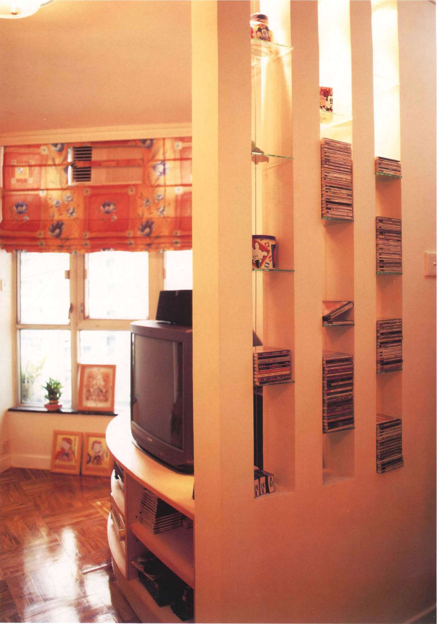 鉴于这所房子面积比较小,设计师特别设计了一个附设餐台的入墙柜,提供业主一个更富弹性的空间布局。如果不使用餐台时可以折合并收藏于饰柜之下,饭厅就变得宽敞起来。如此具创意的方案在客厅也可以见到,一道纯白色的弧形木墙装于电视柜旁边,把原有的墙壁延伸开来,也顺势加强了走廊的深度。此外,设计师为了令走廊更增通透感,墙身特设安装玻璃层板的长方形架子,用作摆放激光唱片及日用品;当射灯映照着精致的摆设时,整个客厅顿时添上更多缤纷悦目的色彩。