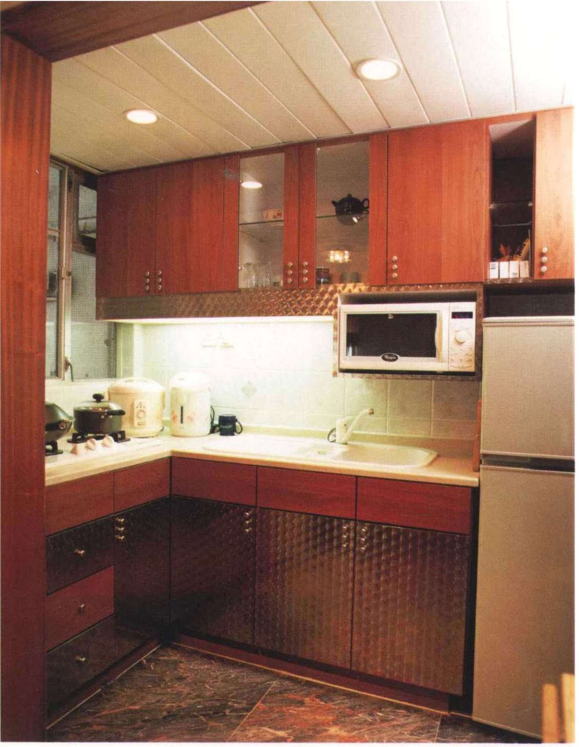 厨柜由樱桃木及不锈钢面板的西德胶板构造,配合玛瑙红的地面云石,为整个厨房营造了高雅的气派。