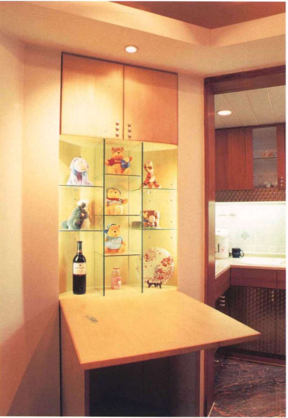邻近厨房的入墙柜摆放了屋主的珍藏品,在射灯的照亮下整个柜子更星色彩夺目,为饭厅添上了一点情趣。